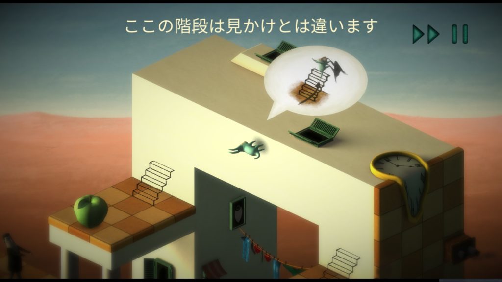 このゲームの最大の特徴はだまし絵のようなステージでの移動!階段を使うと壁を歩くようなことも可能です。