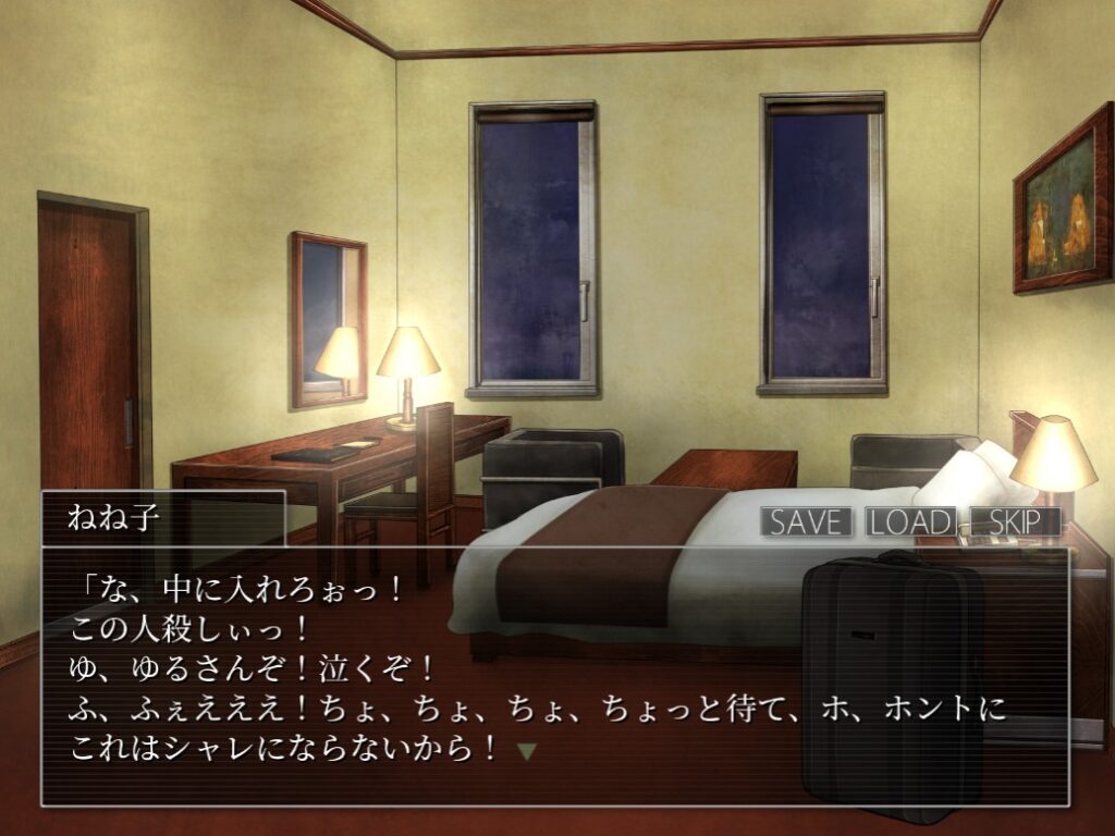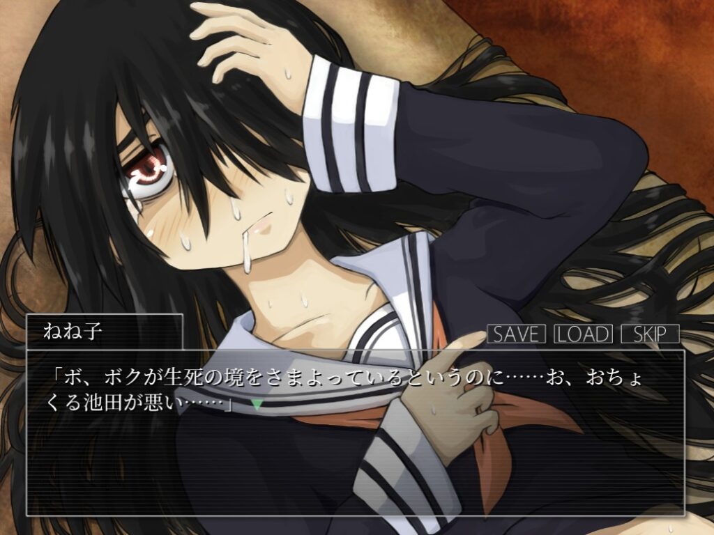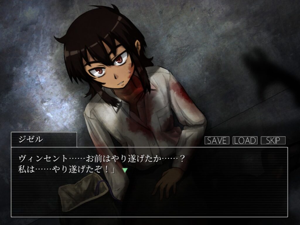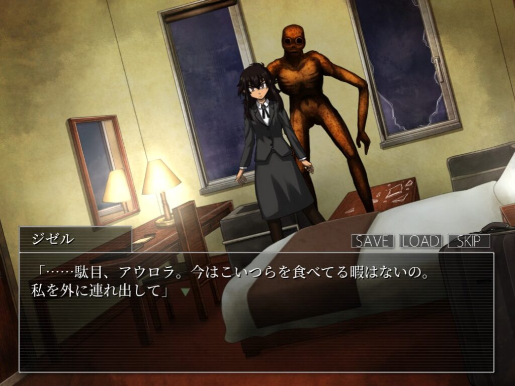 本作をプレイする上で、ホラーやグロ要素が苦手な方に少しだけ注意点があります。 まずホラー要素として、画面に急にドン!と出てくるジャンプスケア要素がいくつか存在します。さらに、制限時間付きの選択肢で焦らされる場面もあるため、パニックになりやすい方は注意が必要です。怖さの体感としては、以前レビューした『パラノマサイト』よりも少し怖いくらいでした。