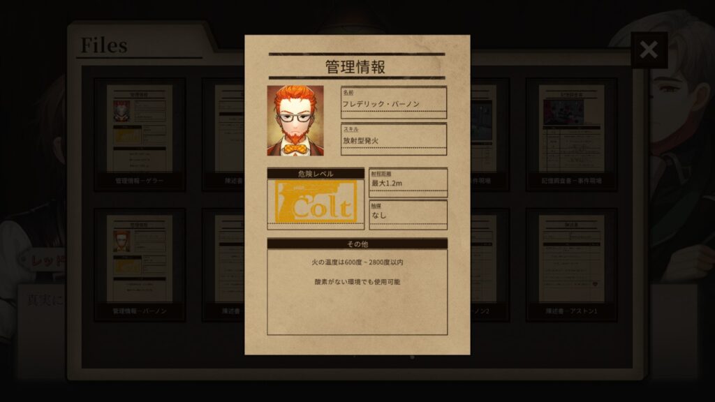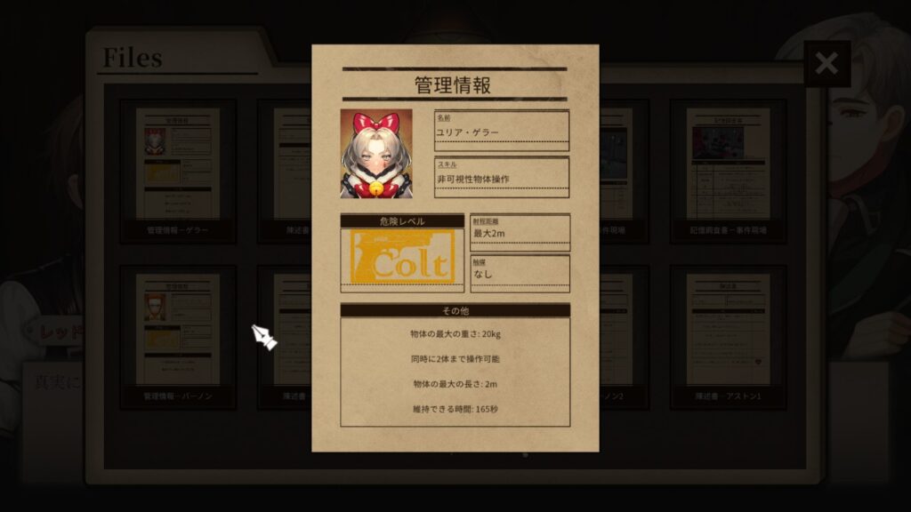 ミステリーとして無理がありそうに見えますが、実はその逆。プレイヤーには各能力者の「スキルに関する詳細な資料」が渡されます。