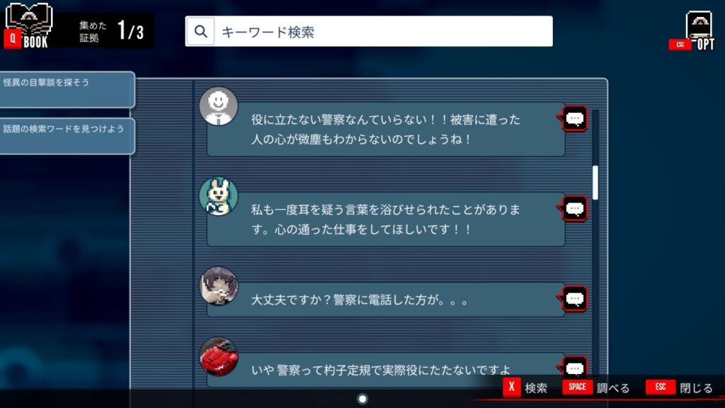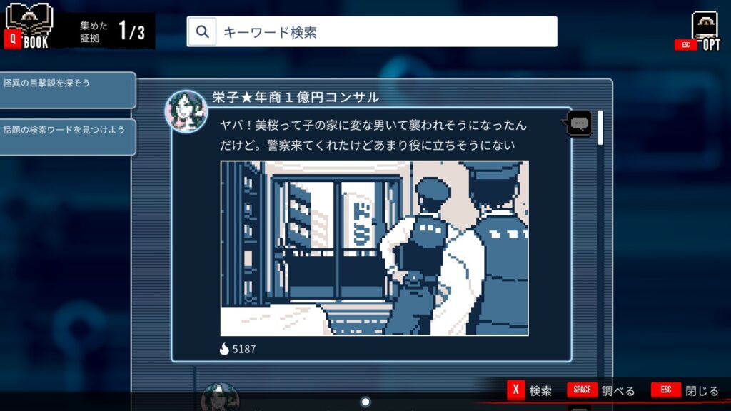 本作はアクション要素がない、純粋なミステリー・推理アドベンチャーゲームです。最大の特徴は、都市伝説の不気味なオカルト感を絶妙に漂わせるドット絵のグラフィック。 物語はSNSが盛んな現代を舞台にしており、ゲーム内でもスマホを使って「X(旧Twitter)」のような掲示板から情報を集めたり、重要なキーワードを抽出してさらに詳しく検索していくといった、リアルな調査パートが楽しめます。